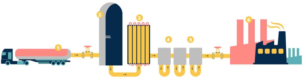 W celu magazynowania gazu ziemnego w postaci skroplonej oraz zmiany jego stanu skupienia budowane są lokalne stacje regazyfikacji, do których gaz ziemny dowożony jest autocysternami.